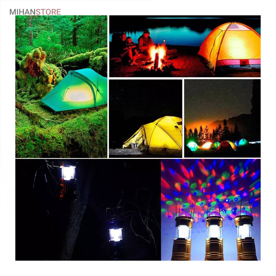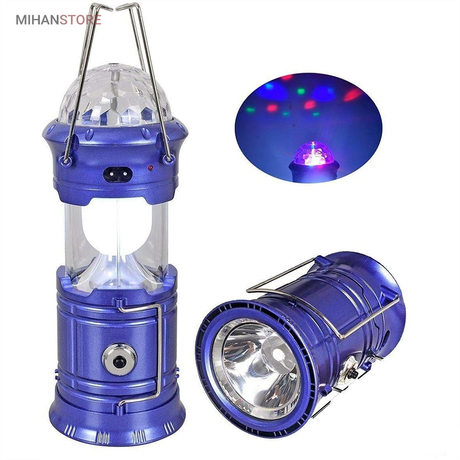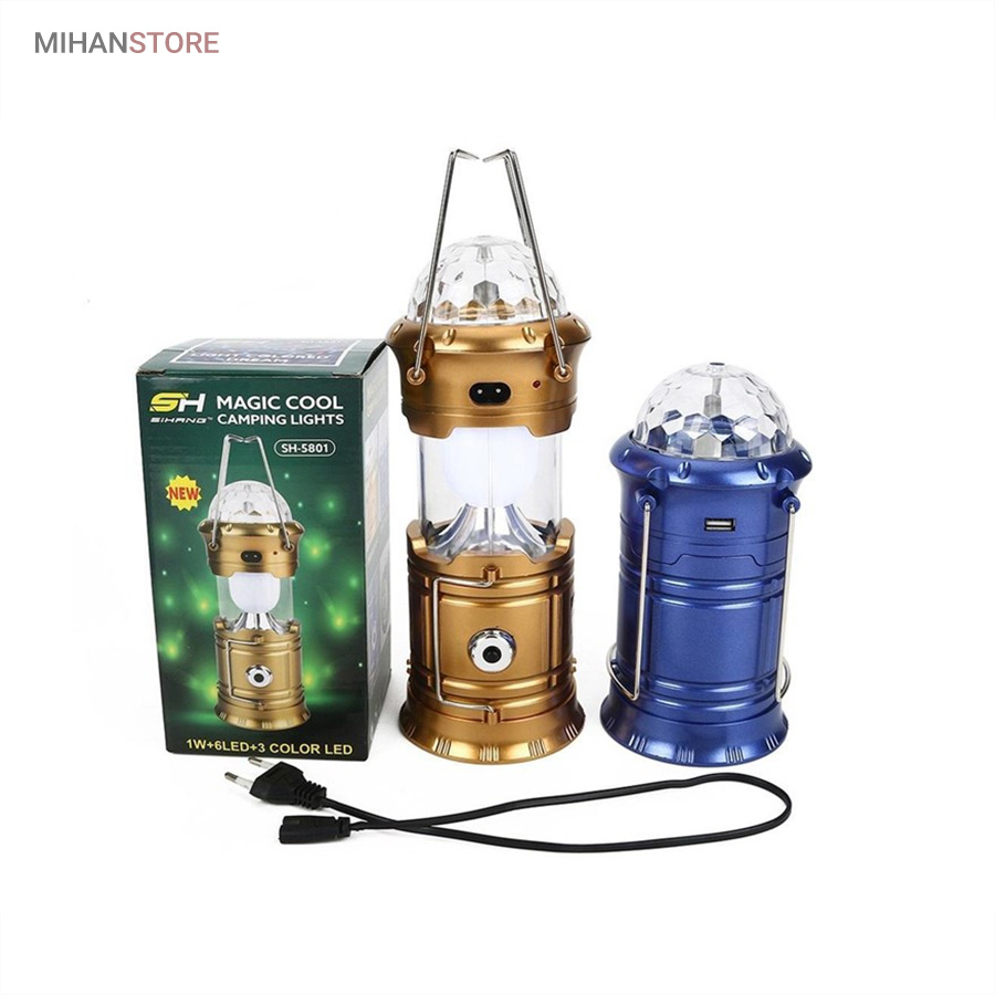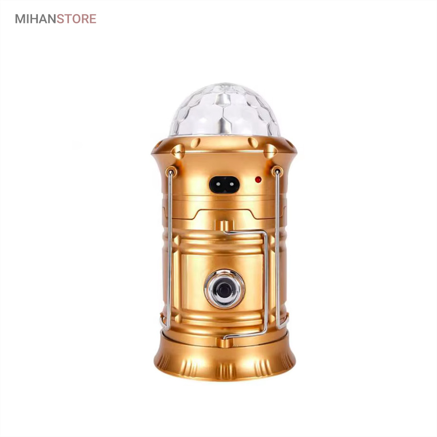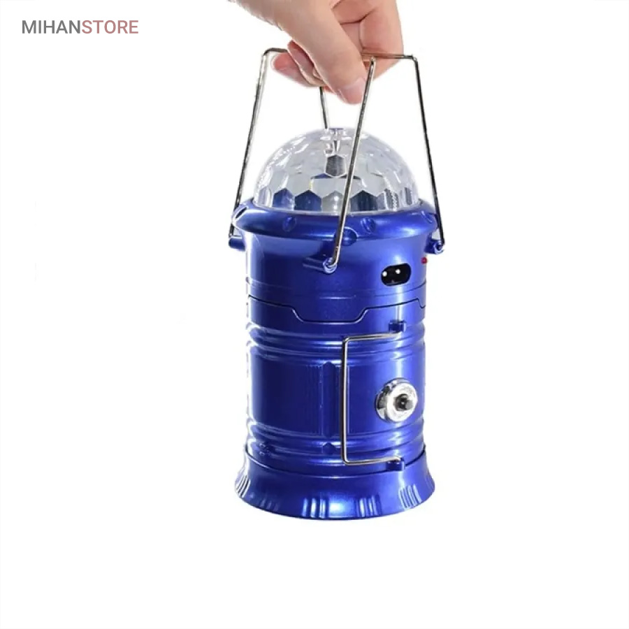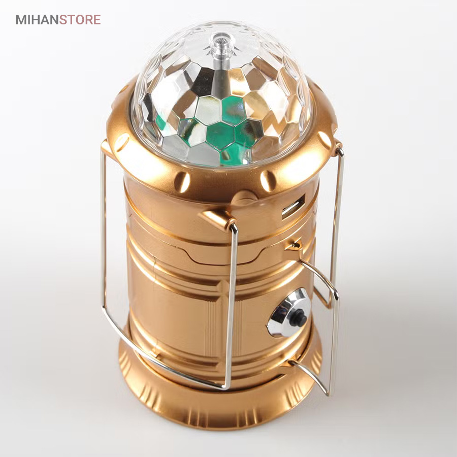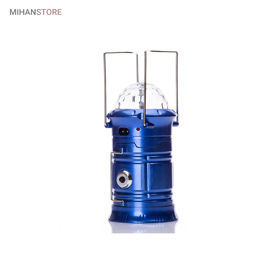 چراغ کمپینگ شارژی رقص نور دار قابل حمل به همراه رقص نور، محصولی با طراحی نوین و بسیار کاربردی است ‏.‏ این چراغ را می‌توان تلفیقی از فانوس های قدیمی و چراغ قوه های جدید و رقص نور مدرن دانست .‏چراغ کمپینگ شارژی رقص نور دار، در واقع یک ابزار چند کاره است و می‌تواند به سادگی نیاز های شما در رابطه با نور را در مسافرت، پیک نیک و جشن های خانواگی و مواردی نظیر آن فراهم کند .‏ شما می‌توانید با کشیدن سر چراغ به سمت بالا ‏(‏کشویی‏)‏، فانوس را روشن کنید و از آن برای تأمین نور محیط استفاده نمایید‏.‏ چراغ اصلی فانوس دارای 6 چراغ ال ای دی است که در کنار هم نور قوه ای را ایجاد می‌کنید‏.‏ همچنین در بالای این فانوس یک شیشه منشوری وجود دارد که هنگام روشن کردن با چرخش و نور پردازی فضای دل انگیزی را برای شما به وجود می‌آورد‏.‏ این محصول خرید خوبی برای استفاده در کمپینگ و طبیعت‌گردی خواهد بود.ورودی برق روی دستگاه بوسیله سیم همراه به برق وصل شده و چراغ را شارژ می‌نماید تا بتوانید به صورت بی سیم از چراغ استفاده نمایید.خروجی یو اس بی روی دستگاه نیز برای شارژ تلفن همراه شما تعبیه شده است و برای شارژ کردن گوشی موبایلتان است.جنس بدنه‌ی این محصول سبک و کم حجم، جنس بدنه از ABS + PC، محکم و بادوام است که به‌سادگی آسیب نمی‌بیند و این امکان را به شما می‌دهد تا مدت‌زمان زیادی به‌صورت مستمر از آن استفاده کنید. این محصول وزن قابل‌قبولی دارد و شما می‌توانید به‌راحتی آن را حمل کنید و در سفر‌ها به‌ همراه داشته باشید.