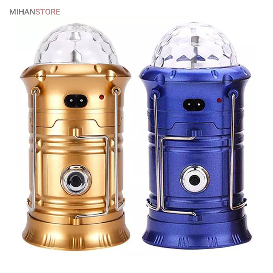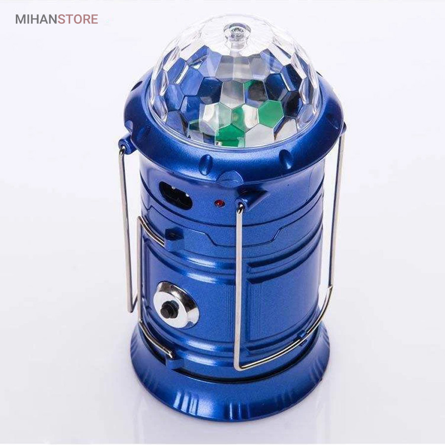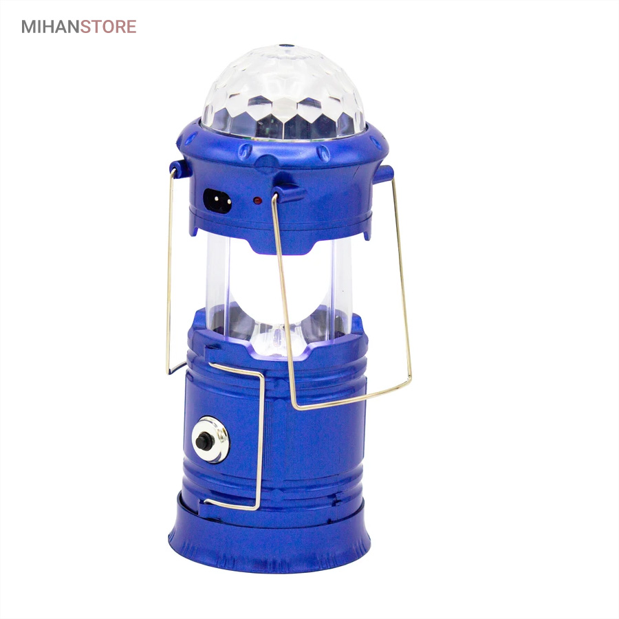 چراغ کمپینگ شارژی رقص نور دار قابل حمل به همراه رقص نور، محصولی با طراحی نوین و بسیار کاربردی است ‏.‏ این چراغ را می‌توان تلفیقی از فانوس های قدیمی و چراغ قوه های جدید و رقص نور مدرن دانست .‏چراغ کمپینگ شارژی رقص نور دار، در واقع یک ابزار چند کاره است و می‌تواند به سادگی نیاز های شما در رابطه با نور را در مسافرت، پیک نیک و جشن های خانواگی و مواردی نظیر آن فراهم کند .‏ شما می‌توانید با کشیدن سر چراغ به سمت بالا ‏(‏کشویی‏)‏، فانوس را روشن کنید و از آن برای تأمین نور محیط استفاده نمایید‏.‏ چراغ اصلی فانوس دارای 6 چراغ ال ای دی است که در کنار هم نور قوه ای را ایجاد می‌کنید‏.‏ همچنین در بالای این فانوس یک شیشه منشوری وجود دارد که هنگام روشن کردن با چرخش و نور پردازی فضای دل انگیزی را برای شما به وجود می‌آورد‏.‏ این محصول خرید خوبی برای استفاده در کمپینگ و طبیعت‌گردی خواهد بود.ورودی برق روی دستگاه بوسیله سیم همراه به برق وصل شده و چراغ را شارژ می‌نماید تا بتوانید به صورت بی سیم از چراغ استفاده نمایید.خروجی یو اس بی روی دستگاه نیز برای شارژ تلفن همراه شما تعبیه شده است و برای شارژ کردن گوشی موبایلتان است.جنس بدنه‌ی این محصول سبک و کم حجم، جنس بدنه از ABS + PC، محکم و بادوام است که به‌سادگی آسیب نمی‌بیند و این امکان را به شما می‌دهد تا مدت‌زمان زیادی به‌صورت مستمر از آن استفاده کنید. این محصول وزن قابل‌قبولی دارد و شما می‌توانید به‌راحتی آن را حمل کنید و در سفر‌ها به‌ همراه داشته باشید.
